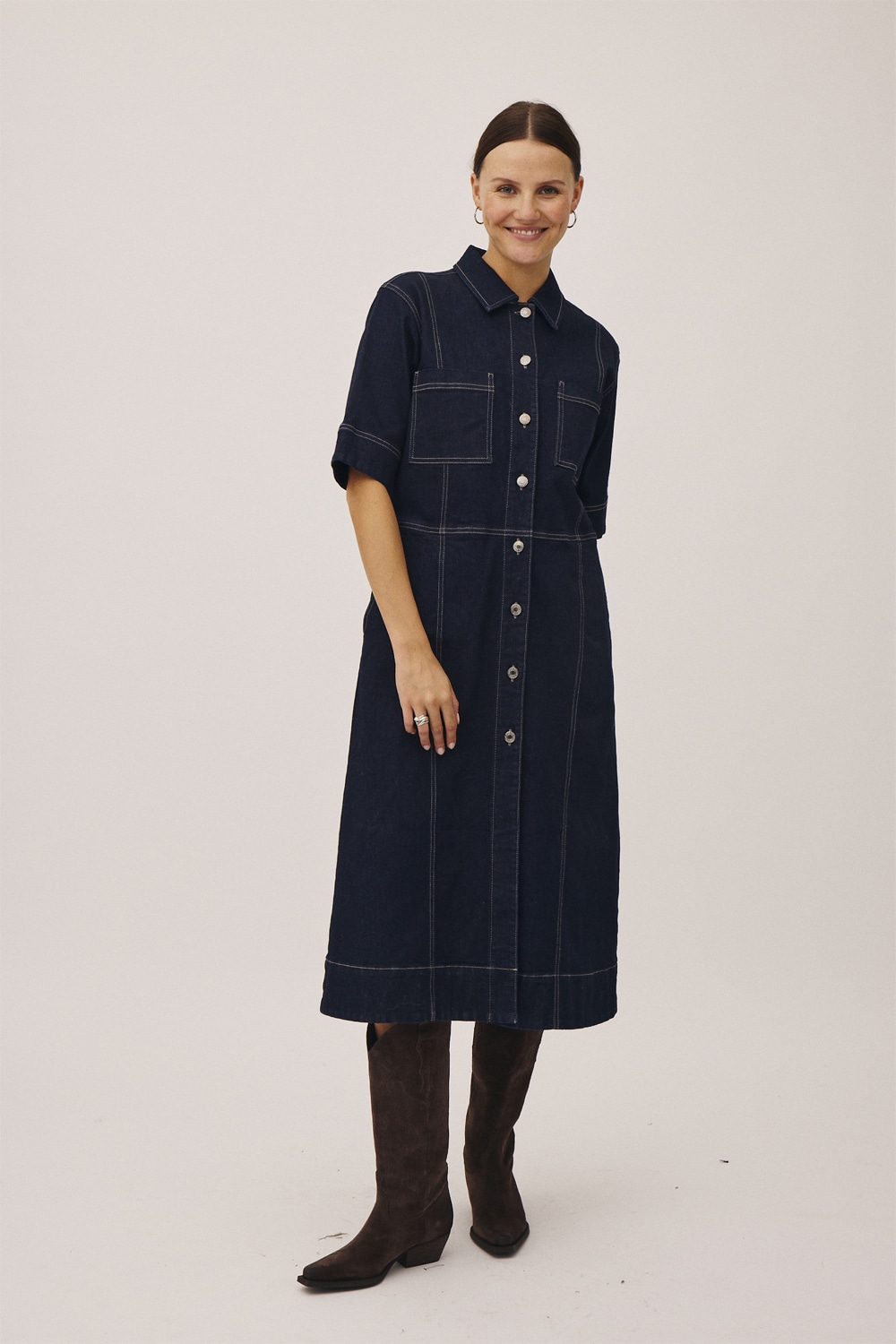Denimkjole fra Magasin du Nord Collection i den blødeste kvalitet af 99% økologisk bomuld med GOTS-certificering. Kjolen er enkel i modellen med knaplukning, bryst- og sidelommer, korte ærmer samt en let A-facon i skørtet. En casual kjole i den absolut læ
