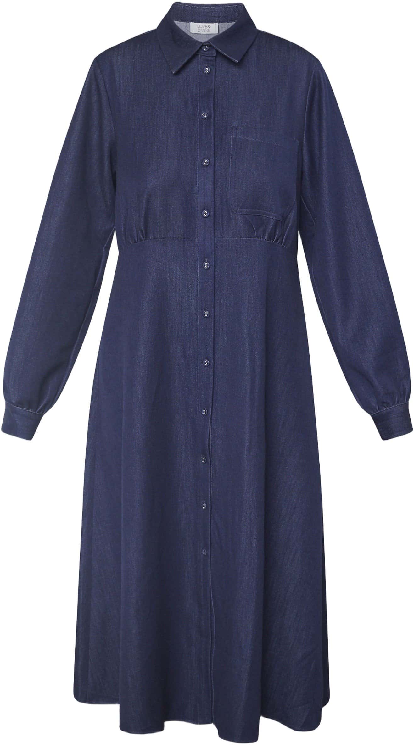 er en elegant lang denimkjole med klassisk skjortekrave, knaplukning, brystlomme og en flatterende pasform i taljen. Modellen har størrelse S.