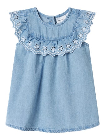 Yndigste kjole til de helt små fra Name it. Kjolen er i smørblød denim kvalitet og har en smuk blondekant. Kjolen er ærmeløs og lukkes på ryggen med knapper.