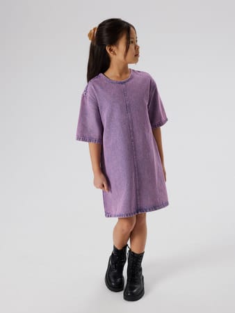 Den sejeste denim kjole. Kjolen er i en flot lilla denim kjole i et løst fit. den har 3/4 ærmer og en knap lukning bagpå.