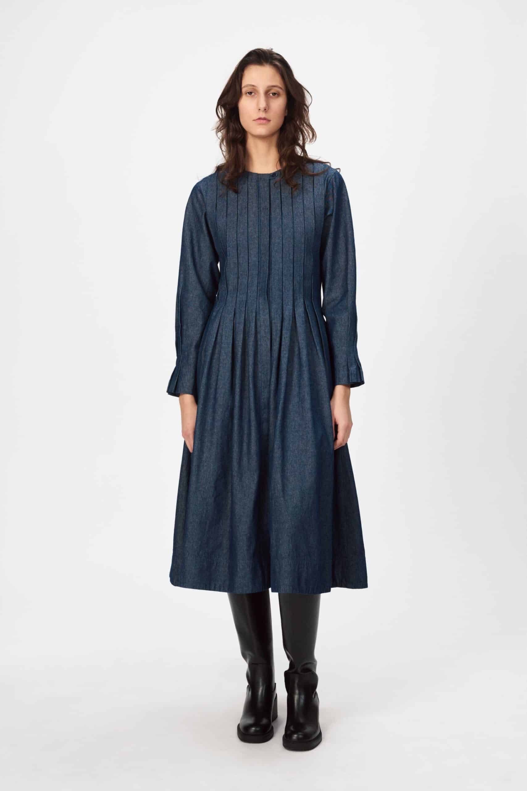 Nevada Dress fra nué notes er en stilfuld midi-kjole i en smuk desaturated denim farve. Kjolen har en skjult knaplukning foran og er designet med læg både foran og bagpå, hvilket giver volumen til skørtet. Den runde hals og de lange ærmer med læg i bunden