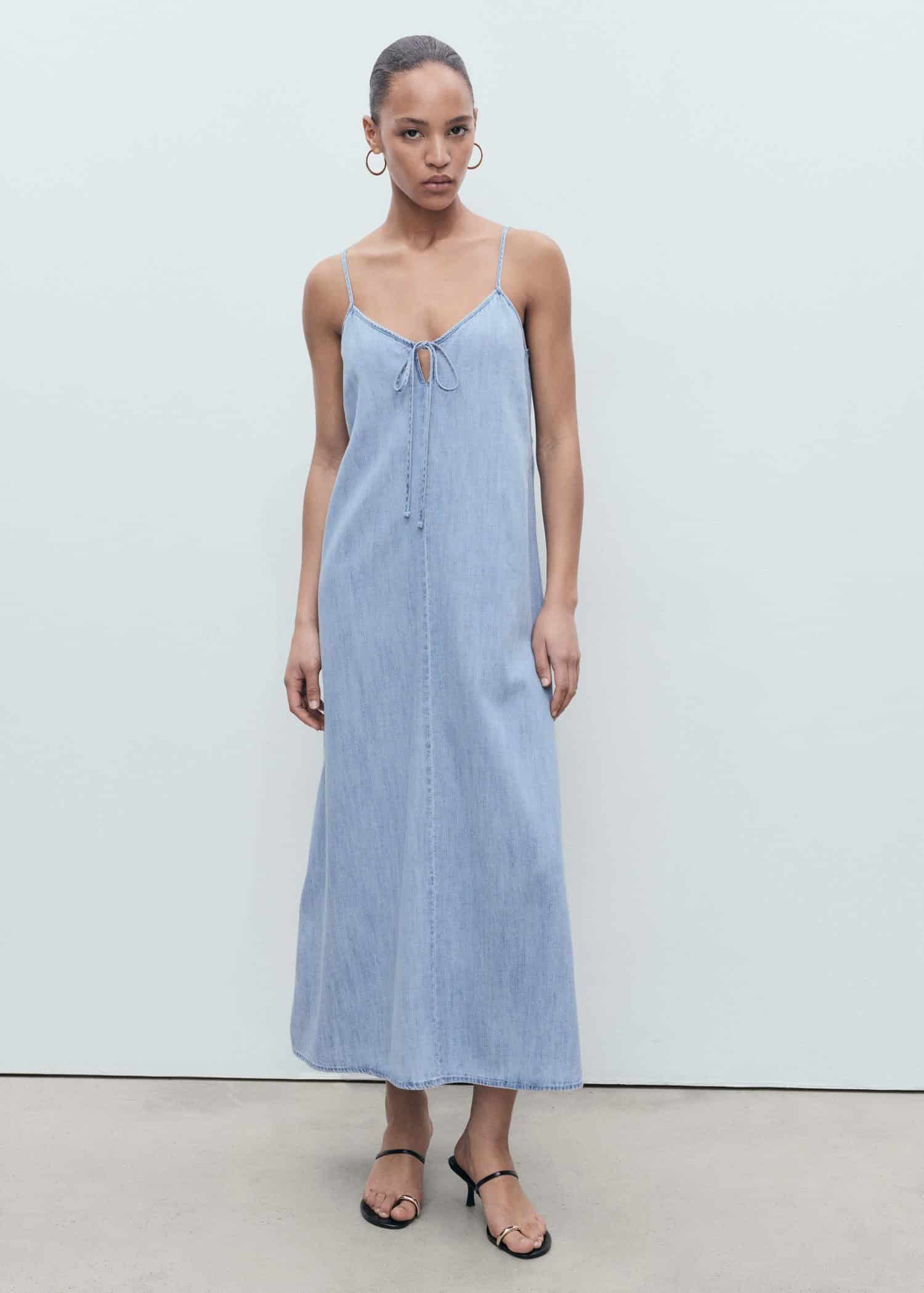 Bomulds- og hørblandingsstof, Denim jeans-stil, Langt Design, Lige Design, V-hals, Ærmeløs, Tynde stropper, Bow-detalje på halsudskæringens knudelukning i halsen,,. INGEN OVERSÆTTELSE 104,0. INGEN OVERSÆTTELSE 96,6