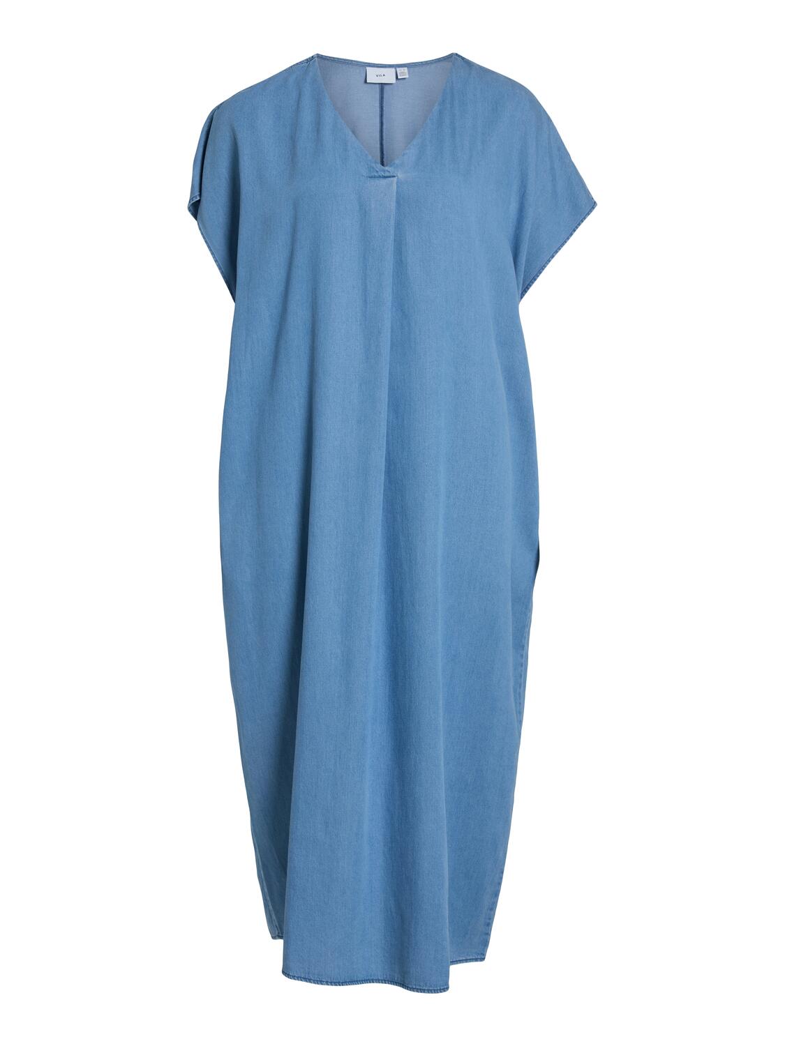 Denne vare udgår af sortiment og sælges til udsolgt. Vinea midi kjolen fra Vila er fremstillet i et denimlignende materiale, med korte ærmer og en midi længde. Kjolen har høje slidser i begge sider, en løs pasform og er designet med en V-udskæring.